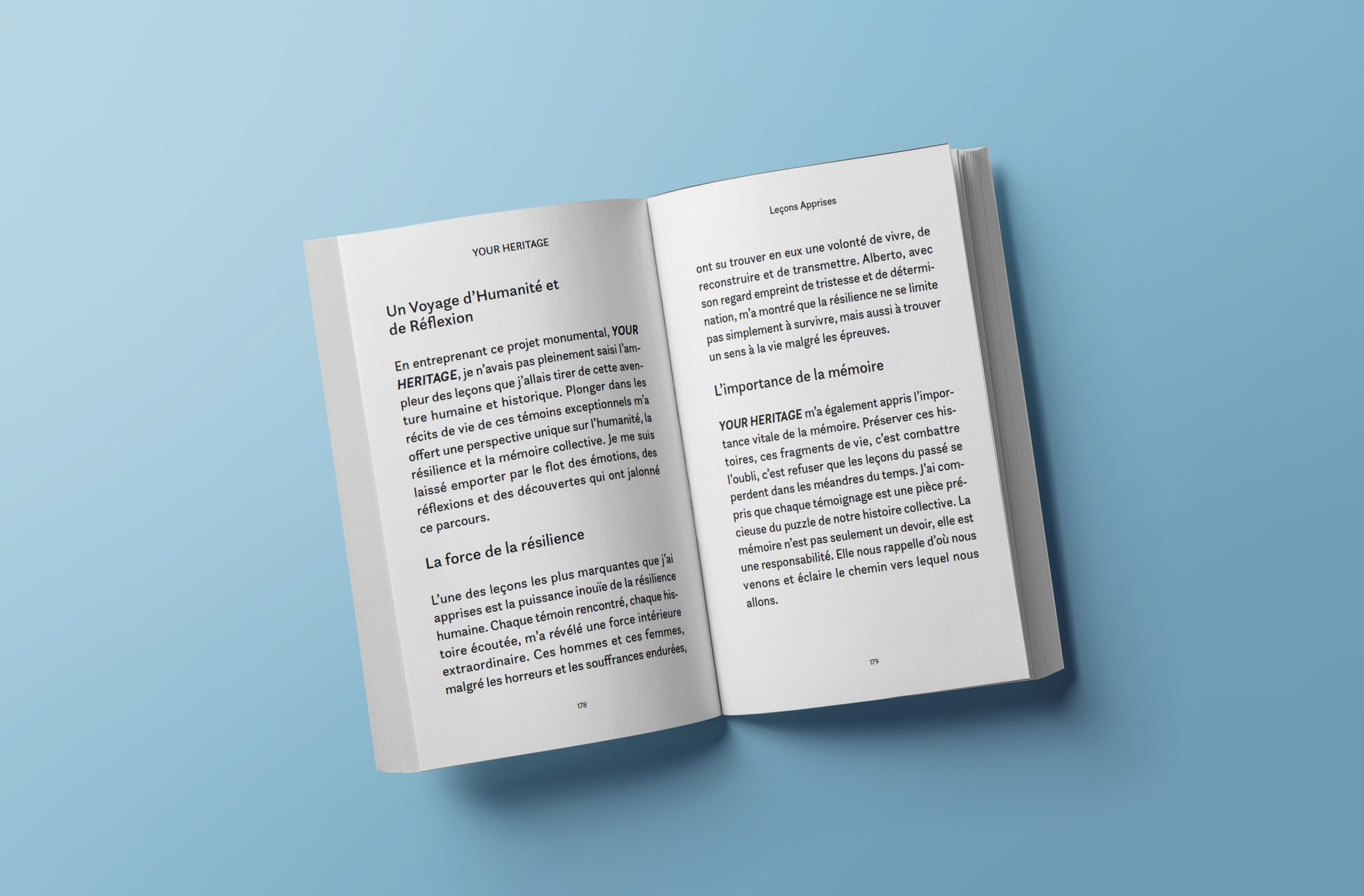 Découvrez YOUR HERITAGE - THE BOOK, un ouvrage captivant qui vous plonge au cœur d'une aventure humaine unique. Ce livre raconte avec émotion et sincérité les rencontres, les témoignages et les défis surmontés pour préserver la mémoire collective. Véritable prolongement de l'exposition, il peut aussi se lire indépendamment, offrant une immersion dans les récits marquants de celles et ceux qui ont façonné l'histoire.